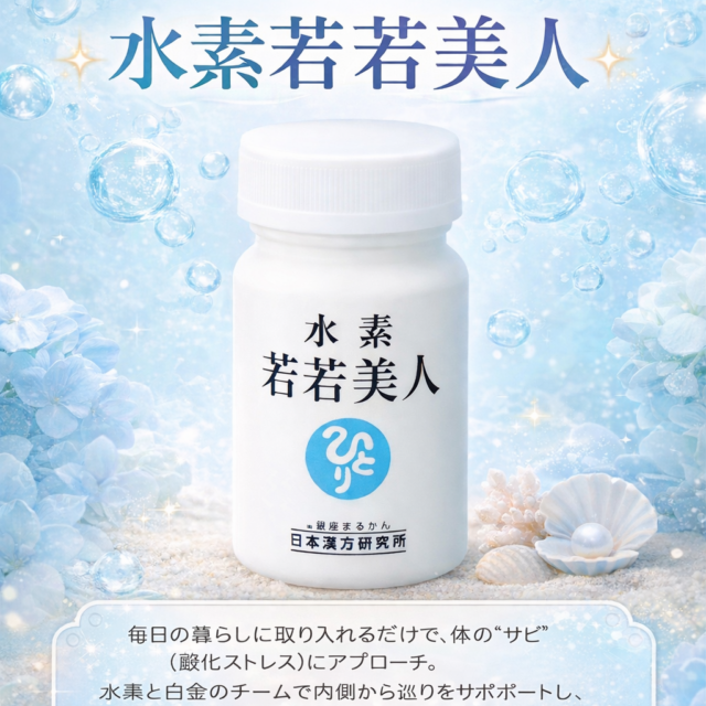 「まるかんの新サプリ『水素若若美人』が誕生。水素と白金の抗酸化パワーで体内のサビ(活性酸素)にアプローチ。水素を安定的に発生させ、腸活・血流・代謝もサポート。毎日、健やかで若々しい自分へ。」